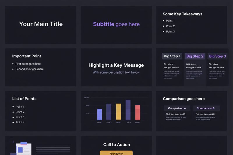 Each slide type represents a clear way of explaining something: a definition, a comparison, a diagram with text, a list next to an image.